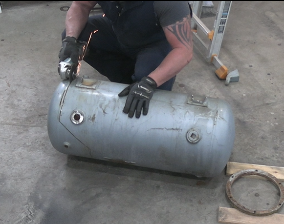 Cutting into a recycled air tank to create the waist section for the Iron Giant sculpture build, showing Dean in the workshop using an angle grinder.