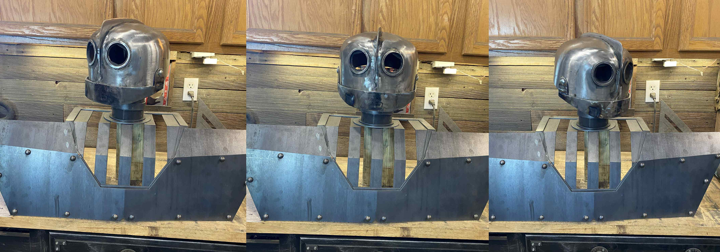 Side-by-side photos showing the articulated head movement of the custom-built Iron Giant sculpture by Dean Furniture Artist, highlighting how the head tilts and rotates in different directions.