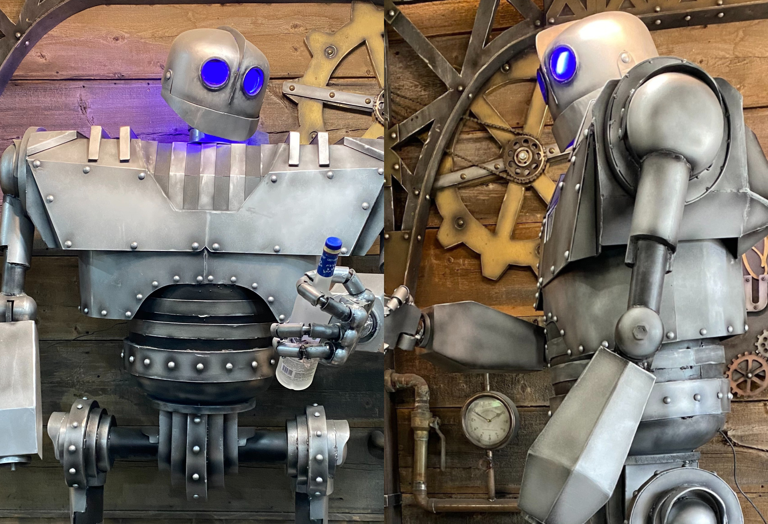 Side-by-side photos of a custom 8-foot Iron Giant sculpture by Dean Furniture Artist—facing forward with a curious, friendly expression, and turned to the side with a strong, battle-ready stance. Built from recycled steel with glowing blue eyes and articulated joints.